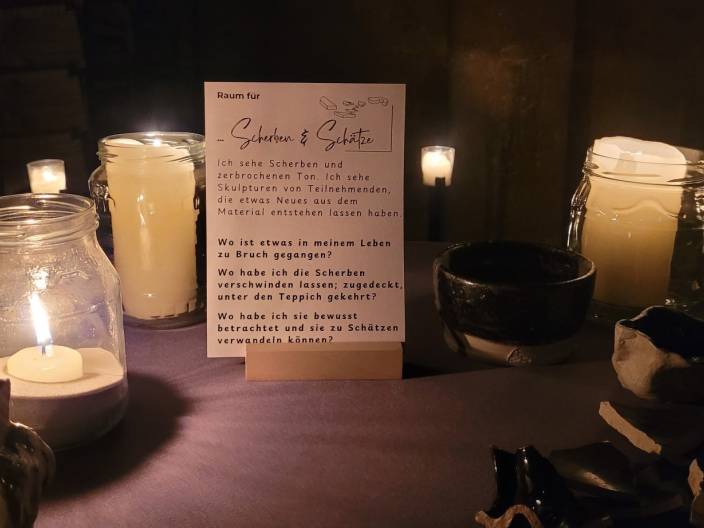 Am 17. November 2024 fand von 17 bis 20 Uhr die bewegende Abschlussveranstaltung „Raum für deine Risse“ in der Elisabethkirche statt, stimmungsvoll erleuchtet von Kerzenlicht. Mit Poesie und Musik von Jelena Herder und dem Friedenssingen für die Ukraine und der ganzen Welt sowie Stationen zum Innehalten, Nachdenken und Austausch bot der Abend Raum für die persönlichen Lebensbrüche.