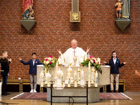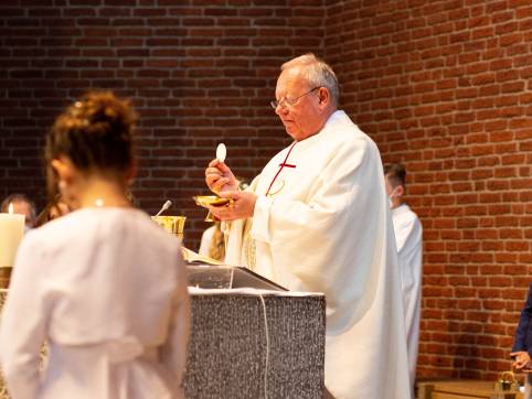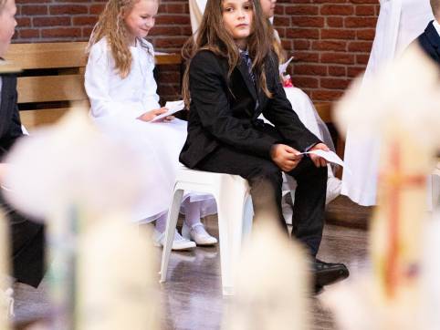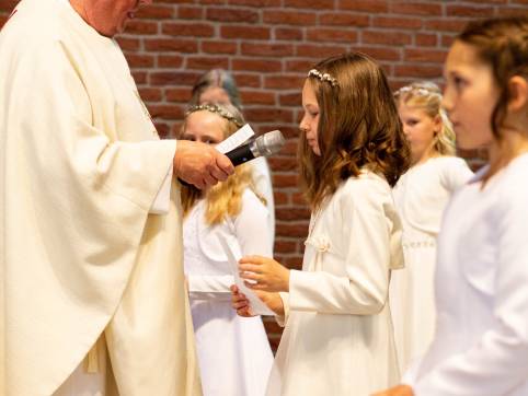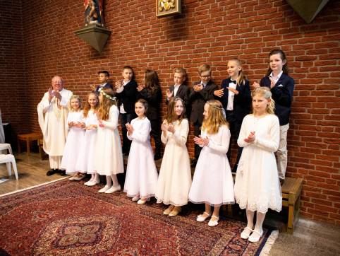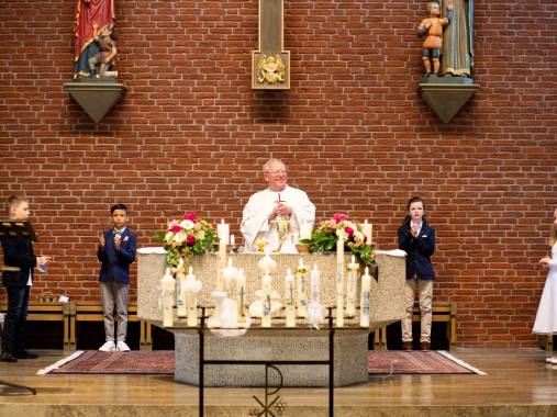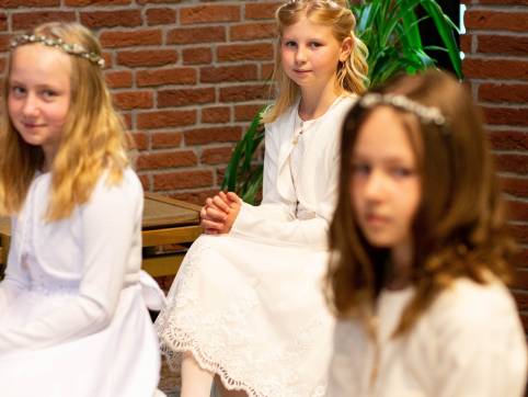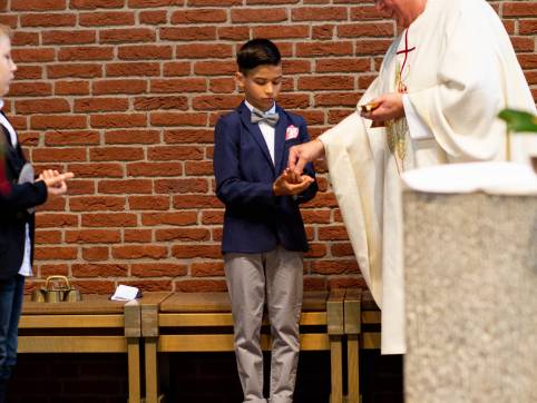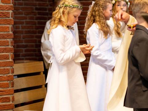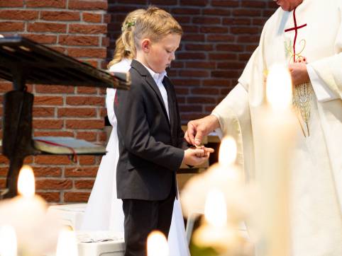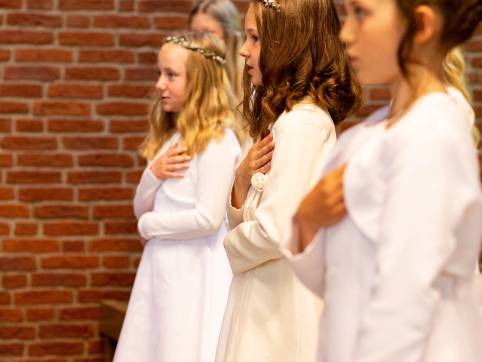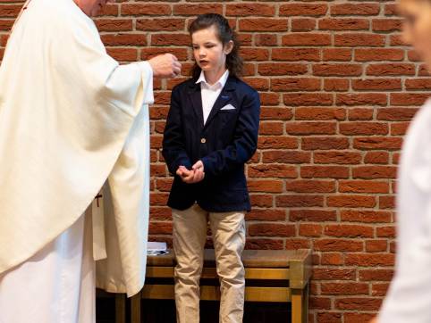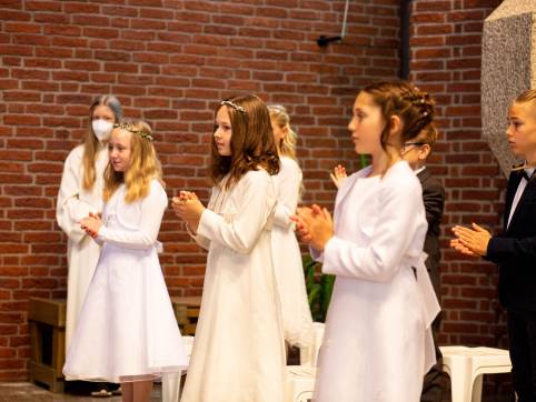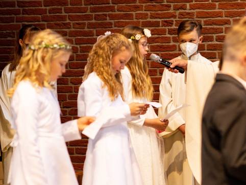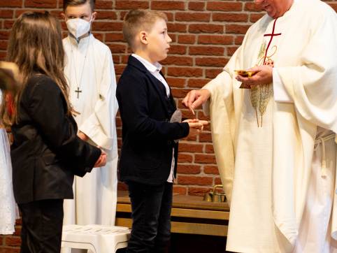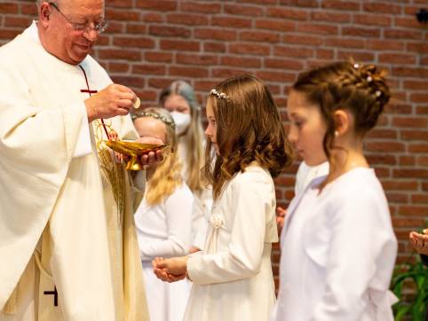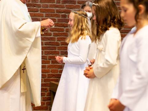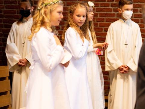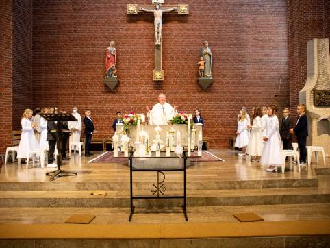 Die Erstkommunion erfolgt im Rahmen einer feierlichen Hl. Messe, traditionell in der ersten Woche nach Ostern - auf Grund der Pandemie verschoben auf das Fronleichnamsfest. Grundsätzlich läuft die Eucharistiefeier wie gewohnt ab. Coronabedingt ziehen die Kommunionkinder nicht mit dem Priester gemeinsam ein, sondern sitzen bereits auf ihren Stühlen um den Altar herum, auf Abstand. Bei der Austeilung der Kommunion empfangen zunächst die Kommunionkinder den Leib des Herrn, bevor die Familien kommunizieren.