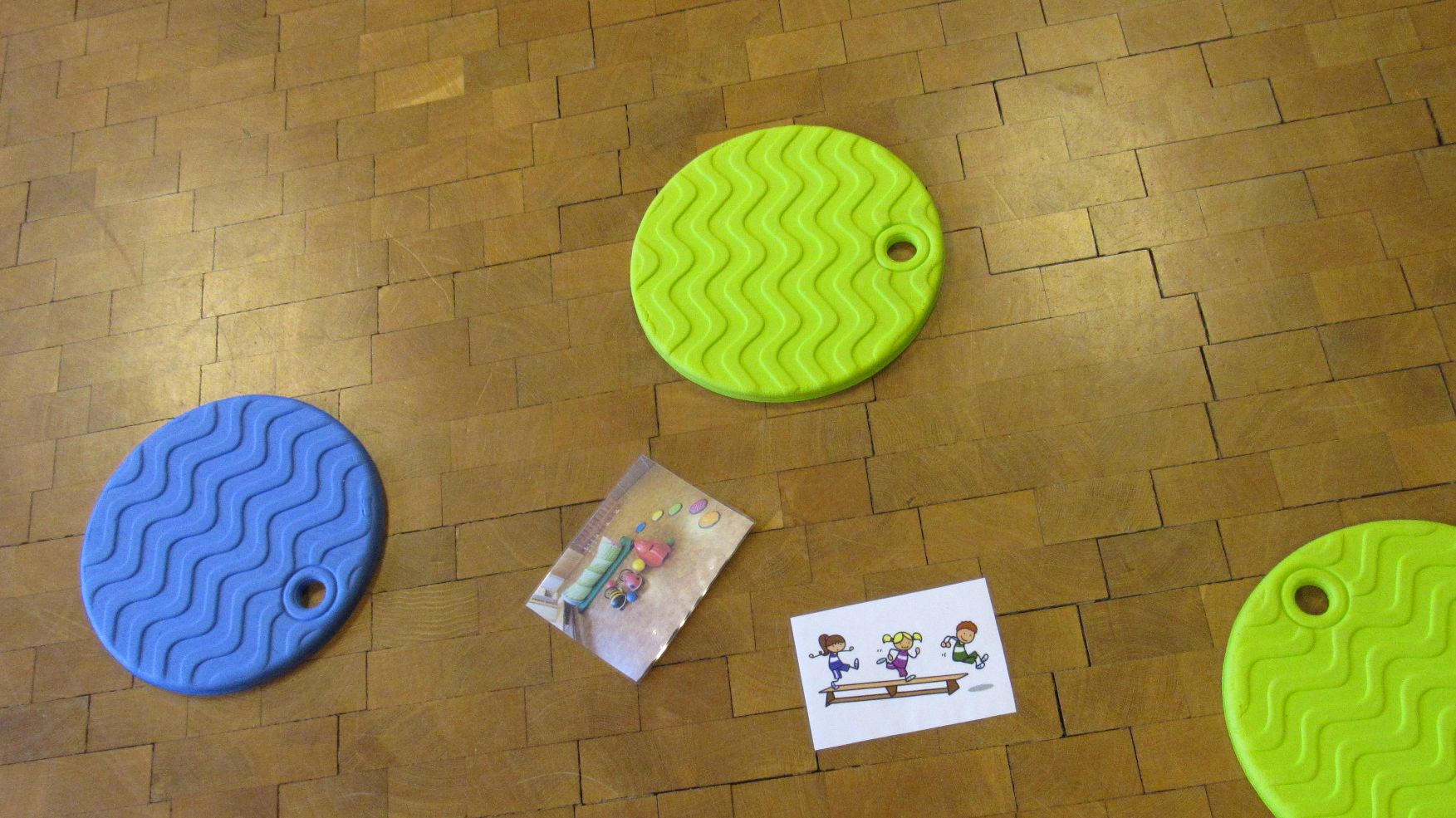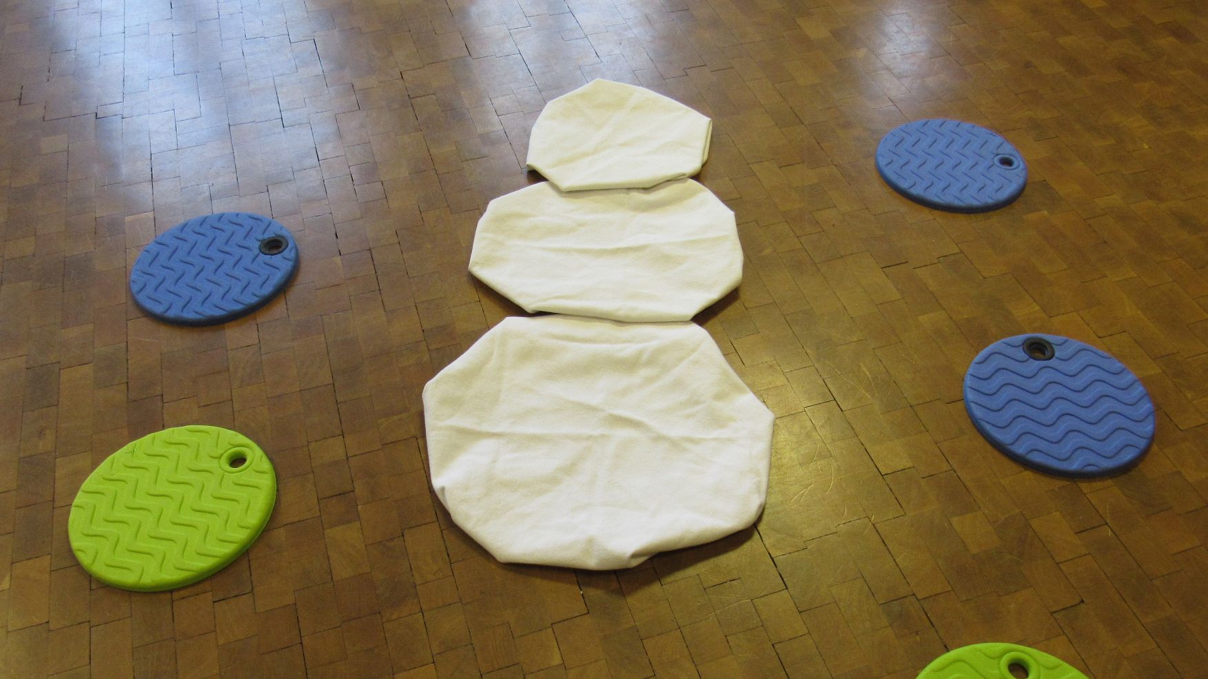 Station 4: Einen „hügeligen Weg“ überqueren (eine Turnmatte wird auf Gegenstände gelegt).