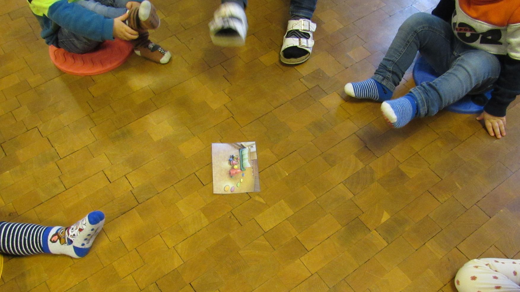 Die folgende Bildergalerie zeigt nicht den gesamten Inhalt meines Praxisprojekts. Mithilfe der Fotos sollen einige Momentaufnahmen dargestellt und Einblicke in meine Arbeit mit den Kindern gezeigt werden: In einem Sitzkreis beginnen und beenden wir alle Projekttreffen in der Kleingruppe. Dort begrüßen wir uns mit einem kurzen Bewegungslied und besprechen mithilfe von Bildkarten unser nächstes Vorhaben.