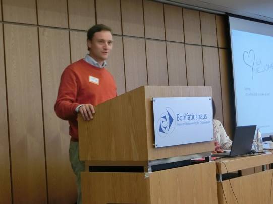 Bereichert wurde der Fachtag durch eine Ausstellung zum Thema Kinderrechte und Adultismus, die Studierende der Fachschule für Sozialpädagogik – Marienschule in Fulda – mit ihrer Zweigstellenleiterin Julia Wißner erarbeitet hatten und nun den Teilnehmenden präsentierten. Die spirituelle Rahmung erfolgte durch Diakon Dr. Martin Nitsche, der am Beginn und Ende des Tages biblische Bezüge zum Buch Jona herstellte.