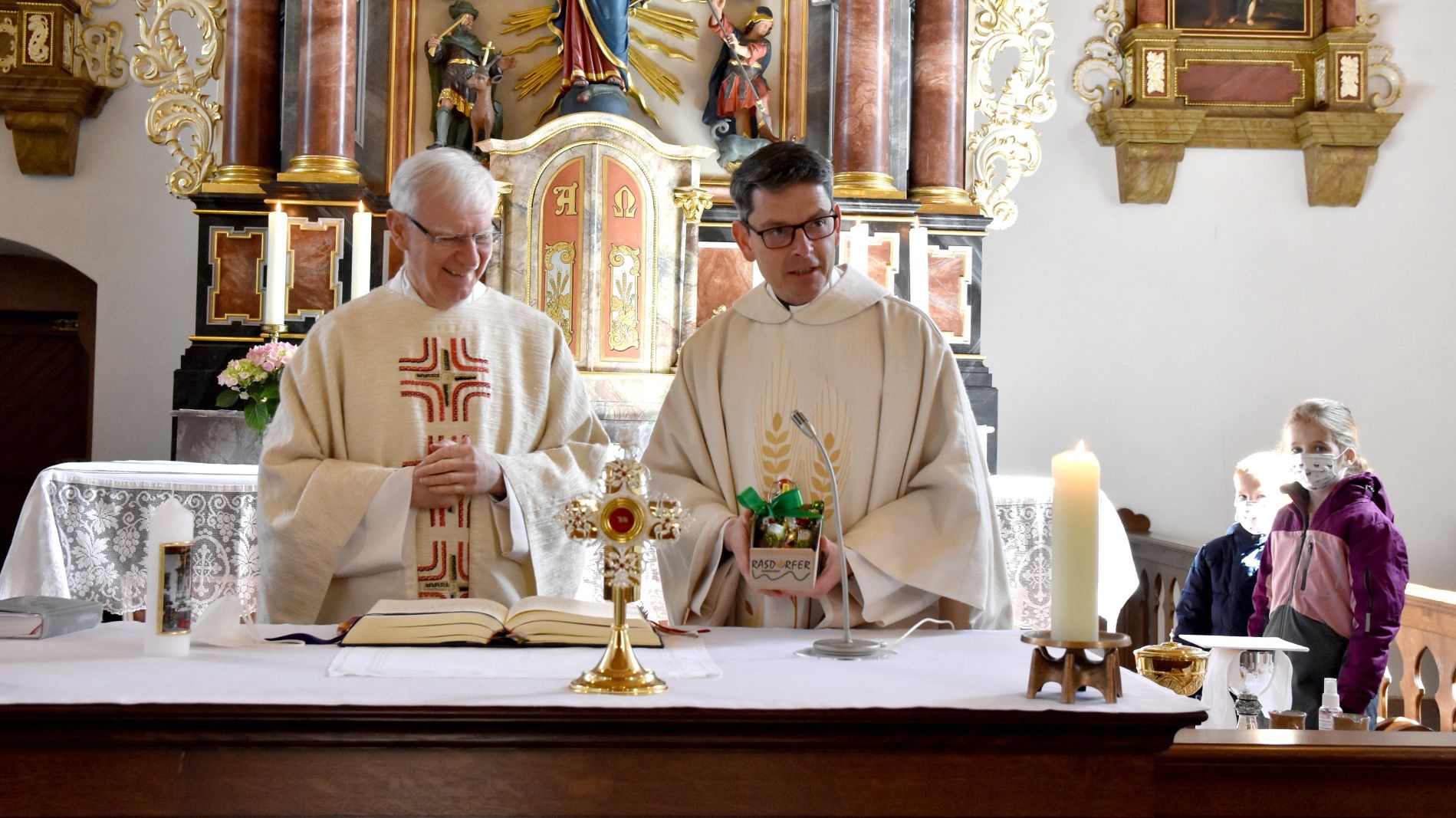 Der sonnige Ostermontag war einladend, den „Heiligen Berg“ des Hessischen Kegelspiels zu besteigen. So waren zahlreiche Gottesdienstbesucher auch aus dem angrenzenden Geisaer Amt, der Rhön und dem Fuldaer Land anzutreffen. Um die empfohlenen Abstands- und Hygieneregeln einhalten zu können, war der Außenlautsprecher installiert worden. Gerhard Stanke, der gemeinsam mit Dechant Markus Blümel der Eucharistiefeier vorstand, betonte zu Beginn seiner Predigt, dass er sich freue, das Wallfahrtsjahr eröffnen zu dürfen und die Gottesdienstbesuchenden so zahlreich gekommen seien. Leider werde die Osterfreude durch den Krieg in der Ukraine und die Millionen von Flüchtlingen überschattet. Mit Recht könne man die Frage stellen, wo Gott in dieser Zeit sei. An einer Begebenheit aus einem Konzentrationslager verdeutlichte er, dass Jesus Christus den Weg des leidenden Menschen mitgeht. Der Gekreuzigte und Auferstandene sei auch bei den Helfenden. Er suche die Menschen. So wie er sich den Emmausjüngern offenbart habe, so würde Jesus Christus die Menschen führen, die ihm vertrauten. Doch wie die Emmausjünger nach dem Brotbrechen oder Maria Magdalena am Grab ihn nicht hätten festhalten können, lasse er sich auch von uns heutigen Menschen nicht für eigene Wünsche vereinnahmen. Die Osterbotschaft sei, dass Gott einmal alle Fragen beantworte. Der Satz „ die Hoffnung stirbt zuletzt“ stimme so nicht, sondern unsere Hoffnung erfülle sich, wenn wir Suchende seien. Wer mit Osteraugen sehe, wie es der verstorbene Aachener Bischof Klaus Hemmerle genannt habe, solle Zeugnis geben, dass Gott in Jesus Christus das Böse besiegt habe und ein Leben in Fülle schenken werde. Im Auftrag der Pfarrei Rasdorf dankte Winfried Möller dem ehemaligen Fuldaer Generalvikar für seine mehr als zehnjährige Bereitschaft der Eröffnungsfeier auf dem Gehilfersberg vorzustehen, was mit viel Beifall von den Gläubigen quittiert wurde. Sein Dank galt auch dem Organisten Michael Heller, der den Gottesdienst musikalisch mitgestaltete und den Küsterehepaaren Schmitt und Bock, die die Kirche nach der Winterpause hergerichtet hatten. Pfarrer Markus Blümel überreichte Gerhard Stanke ein traditionelles Rasdorfer Präsent. Zu Beginn des Gottesdienstes hatte er darauf hingewiesen, dass im Gottesdienst auch der durch den Krieg in vielfältiger Weise Betroffenen gedacht werden würde.