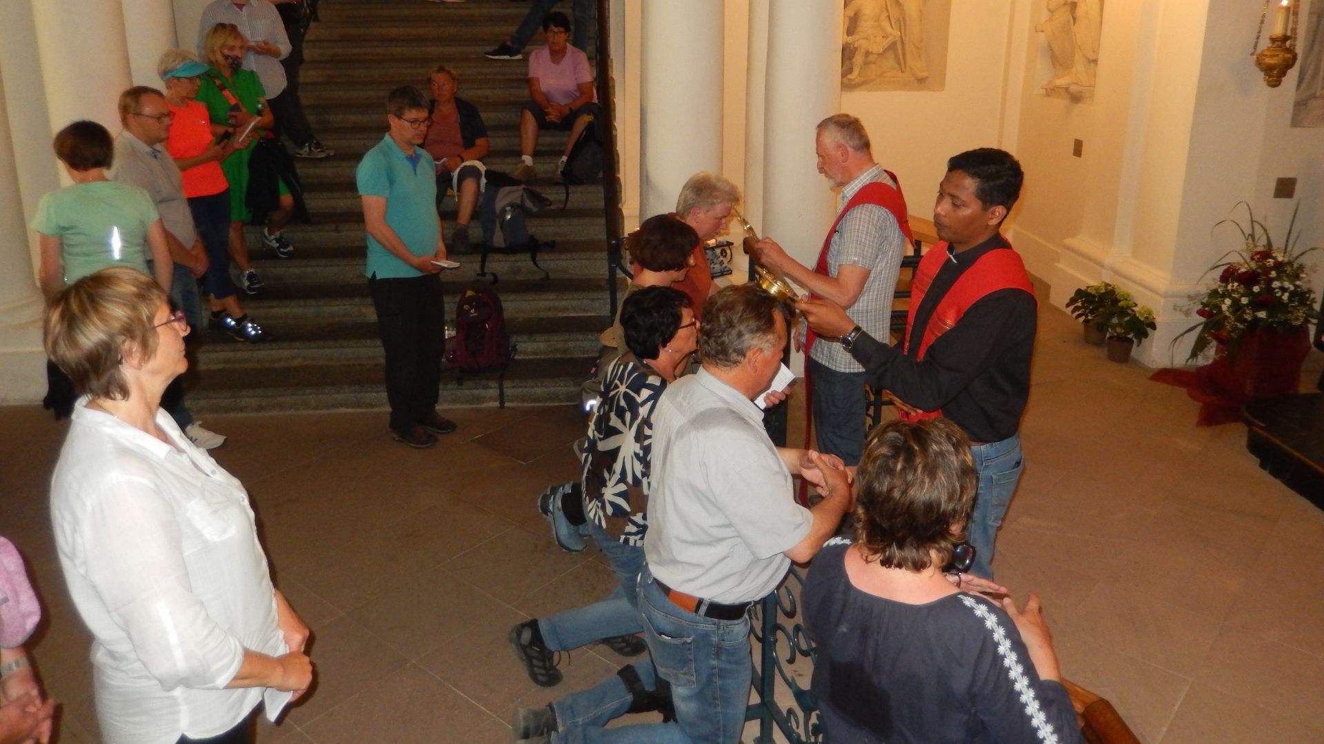 Es ist sehr erfreulich, dass die Wallfahrtsgruppe nach einer zweijährigen Pause auf 65 Teilnehmer angewachsen war. Entlang der Eisenbahnstrecke verlief der Wallfahrtsweg in offenem Wiesengelände bis Rückers und weiter Richtung Eichsberg zur wunderschön und kühl gelegenen Mariengrotte. Die Gebetsanliegen und Fürbitten wurden während der gesamten Wallfahrt durch die Teilnehmer selbst gestaltet und vorgetragen. Am Haunestausee entlang ging es weiter zur ersehnten Kaffeepause nach Steinhaus, wo die Pilgergruppe bereits durch den Pfarrer und die vielen freiwilligen Helfer erwartet wurde. Die Andacht wurde durch den ortsansässigen Pfarrer gehalten, bevor es zur Kuchen-Tafel ging. Gut gestärkt trat die Pilgergruppe die Strecke zur Rast in der Kirche von Lehnerz an, um von dort über die Schrebergärten von Fulda ins Zentrum zu gelangen. Bereits im Schloßgarten wurden die Pilger mit dem Geläut der mächtigsten Glocke im Turm des Fuldaer Doms begrüßt und zum Dom geleitet. Dort angekommen wurde der Heilige Bonifatius mit dem kräftigen Gesang des Bonifatiusliedes und einer Abschlußandacht in der Gruft geehrt. Die Rückreise an die verschieden Startpunkte erfolgte im Bustransfer.