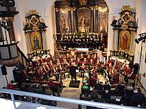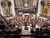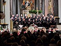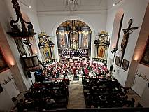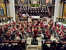 Eine stimmungsvoll illuminierte Kirche, im Altarraum steht ein festlich gekleideter Chor, davor ein imposantes Aufgebot an Musikern mit ihren Instrumenten und ein voll besetzter Kirchenraum.