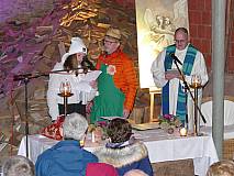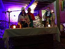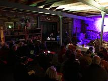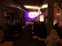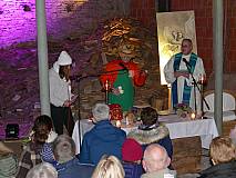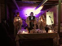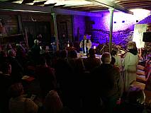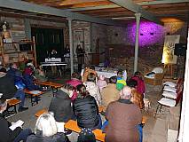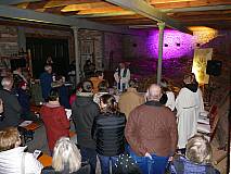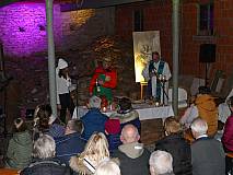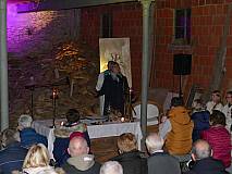 In der heimeligen Atmosphäre der dezent ausgeleuchteten Scheune erfuhren die Besucher am Beispiel einer kleinen Tulpenzwiebel, dass dunkle Zeiten – wie jetzt im November – zum Wachsen wichtig sind. ln einem kurzen Dialog weigerte sich zunächst die kleine Blumenzwiebel (Ann-Sophie Vögler) sich von ihrem Gärtner (Josef Richter) einpflanzen zu lassen. Sie musste erst einsehen, dass es eine gewisse Zeit in Dunkelheit und den Willen zu Veränderung braucht, um etwas Großes und Neues entstehen zu lassen.