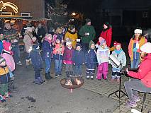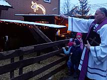 Ziel war die Weihnachtskrippe mit lebensgroßen Figuren und echten Schafen bei Familie Sauerbier, die auf ihren Hof mit kleinen Buden eine weihnachtliche Atmosphäre gezaubert hatte. Pfarrer Ulrich Piesche segnete die Krippe.