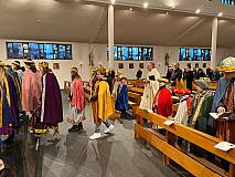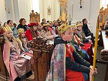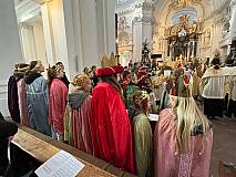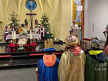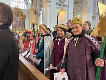 Festlich mit goldenen Kronen, farbenfrohen Königsgewändern und Turbanen gekleidet, zogen die Steinbacher Kinder und Jugendlichen in den Dom ein. Gemeinsam mit anderen Sternsingern aus dem Bistum wurden die Lieder für den Gottdienst geübt. Kurz vor Beginn des Gottesdienstes wurden die angemeldeten Gruppen von Pater Andree Kolla begrüßt und immer, wenn der Name der Pfarrei der Gruppe aufgerufen wurde, applaudierten und jubelten die Kinder. Im Dom erfahren und sehen die Kinder, dass sie nicht alleine als Sternsinger unterwegs sind. Der Gottesdienst wurde von den Sternsingern mitgestaltet.
