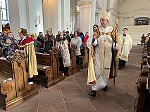 Bischof Dr. Michael Gerber erklärte anhand eines Suchbildes den Sinn von Weihnachten heute und auch vor 2000 Jahren. Danach segnete er Weihrauch, Kreide und auch die Aufkleber. Er entließ die Sternsinger mit einem Versprechen: „Ich segne euch jetzt, und ihr sollt diesen Segen zu den Menschen tragen. Und ihr werdet sehen: Wenn ihr in deren Häuser kommt, wird den Menschen warm ums Herz.“