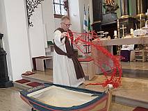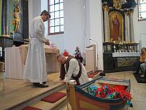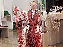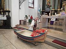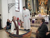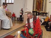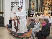 Der ECV marschierte mit seiner ganzen Mannschaft in die Kirche St. Georg in Eiterfeld zum Familiengottesdienst ein. Nach der Begrüßung durch Dechant Markus Blümel wurden wir zum Evangelium von einem Fischernetz auf eine Reise mitgenommen. Das Netz erzählte vom Fischzug des Petrus. Auf beeindruckende Weise wurde die Geschichte von Mitgliedern des ECV’s und dem Kindermitmachgottesdienst Team dargestellt. Besonders hervorzuheben sind die Rollen des Simon – gespielt von Karl – Josef Hohmann und die Rolle von Jesus – gespielt von Dechant Blümel. Simon war mit seinen Freunden hinaus auf den See gefahren. Doch in dieser Nacht fingen sie nichts. Keine Fische, kein Geschäft. Kein Geschäft, kein Geld. Plötzlich kam Jesus in die Mitte. Jesus schickte Simon und seine Freunde erneut auf See. Simon war misstrauisch und sagte: „Meister wir haben die ganze Nacht gearbeitet und nichts gefangen. Aber auf dein Wort hin will ich die Netze nochmal auswerfen.“ Und tatsächlich sie fingen Unmengen an Fischen. Simon kniete zu Jesu Füßen und sagte: „Herr, geh von mir! Ich bin ein sündiger Mensch.“ Jesus sprach: „Fürchte dich nicht – von nun an wirst du Menschen fangen.“
