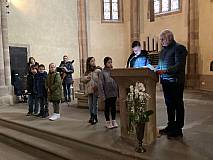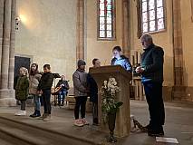 Zu einem Wortgottesdienst am Aschermittwoch waren die Kinder des Kindergartens und die Schülerinnen und Schüler der Hrabanus-Schule Rasdorf in die Stiftskirche eingeladen. Wichtige Elemente waren die Einführung in den Gottesdienst, ein Clown, der noch dachte es sei der Fastnachtsgottesdienst, wurde auf den Beginn der Fastenzeit hingewiesen und zur Mitfeier eingeladen. Dazu legte er sein Clownkostüm ab. Mit dem Verbrennen von Palmzweigen und Luftschlangen wurde den Schülerinnen und Schülern die Herstellung der Asche für das Aschenkreuz gezeigt. Wer wollte, konnte anschließend mit der geweihten Asche das Aschenkreuz empfangen. „Kehr um und glaub an das Evangelium“ so der dabei gesprochene Text. Die Fastenzeit ist eine Zeit der Umkehr und der Einlassung auf das Evangelium. Durch die Vorsätze, die Schülerinnen und Schüler vortrugen, wurden Möglichkeit von Veränderung aufgezeigt. Schülerinnen und Schüler trugen auch die Fürbitten vor. Zwischen den einzelnen Abschnitten hatten Lieder aus dem Liedheft der Pfarrei Rasdorf , die von Edith Wiegand und Birgit Zentgraf auf der Gitarre begleitet wurden, ihren Platz. Sie wurden, wie auch das Vater unser, mit Bewegung gesungen.