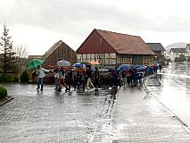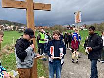 Das Wetter war in den Stunden vor dem Start nicht einladend, das schwere Kreuz über den Fahrradweg zu tragen. Da der Himmel aufklarte machten sich die Kinder, Jugendlichen und Erwachsenen doch auf den Weg. Sieben Stationen befassten sich mit den Schlagworten „Jemand?, Machthaber, Peiniger, Unterstützer, Mutmacherin und Zeuginnen: Mit den dazugehörigen Texten sollten Beziehungen im eigenen Leben entdeckt werden und mit den Begegnungen Jesu verbinden. Es wurde die Fragen nach Begegnungen gestellt, die Mut machen und Kraft geben und welche zu Herausforderungen werden oder an die man Fragen knüpfen kann. Abwechselnd wurde das schwere Holzkreuz von Station zu Station getragen. Leider hielt das Wetter nur bis zur vorletzten Station und die Teilnehmerinnen und Teilnehmer waren froh die Leibolzer Kirche erreicht zu haben. Mit den Fürbitten, dem Vater unsrer und Segen endete der Kreuzweg der Jugend. Anschließend waren alle zum Imbiss und kalten und warmen Getränken in das DGH Leibolz eingeladen, wo fleißige Hände alles gut vorbereitet hatten und man langsam wieder trocken werden konnte.