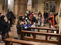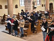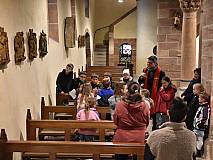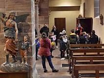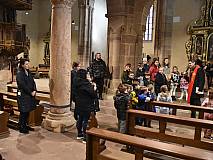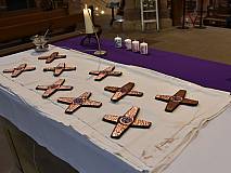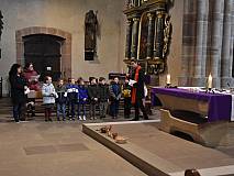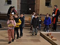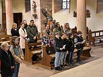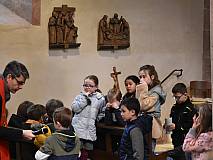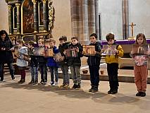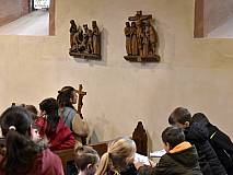 Einen Kreuzweg für Kinder hatte die katholische Kindertagesstätte St. Johannes der Täufer zusammengestellt. Eingeladen waren neben den Schulanfängern des Kindergartens auch die Erstkommunionkinder. Nach dem Eingangslied: „Jesus deine Nähe macht mich froh“, folgten die Kinder und Erwachsenen von Station zu Station dem Kreuz, das wechselnd vorangetragen wurde. Gemeinsam erarbeitet Pfarrer Markus Blümel den Inhalt der jeweiligen Kreuzwegstation. Die Antworten der Kinder zeigten, dass mit ihnen die Geschichte des Leidens und Sterbens Jesu vom Einzug in Jerusalem bis zu seinem Tod erarbeitet worden war. Bei der 12. Station erklang das Lied: „Seht dass Zeichen, sehrt das Kreuz, es bedeutet Leben.“ Die Schulanfänger hatten Bilder gefertigt, die sie erklärten und zu einem Kreuz zusammenlegten. Nach dem Lied: „Leben ist stärker als der Tod“, segnete Pfarrer Markus Blümel die von den Schulanfängern hergestellten Kreuze, die diese mit nach Hause nehmen durften. Mit dem Abschlusslied: „Osterkerze Lebenslicht“ kamen die einzelnen Symbole und ihre Bedeutung, die auf der Osterkerze zu finden sind, zur Sprache.