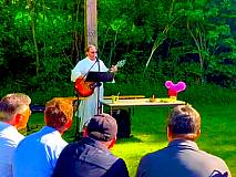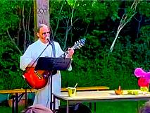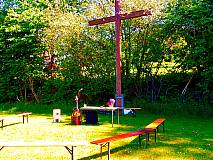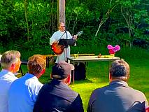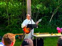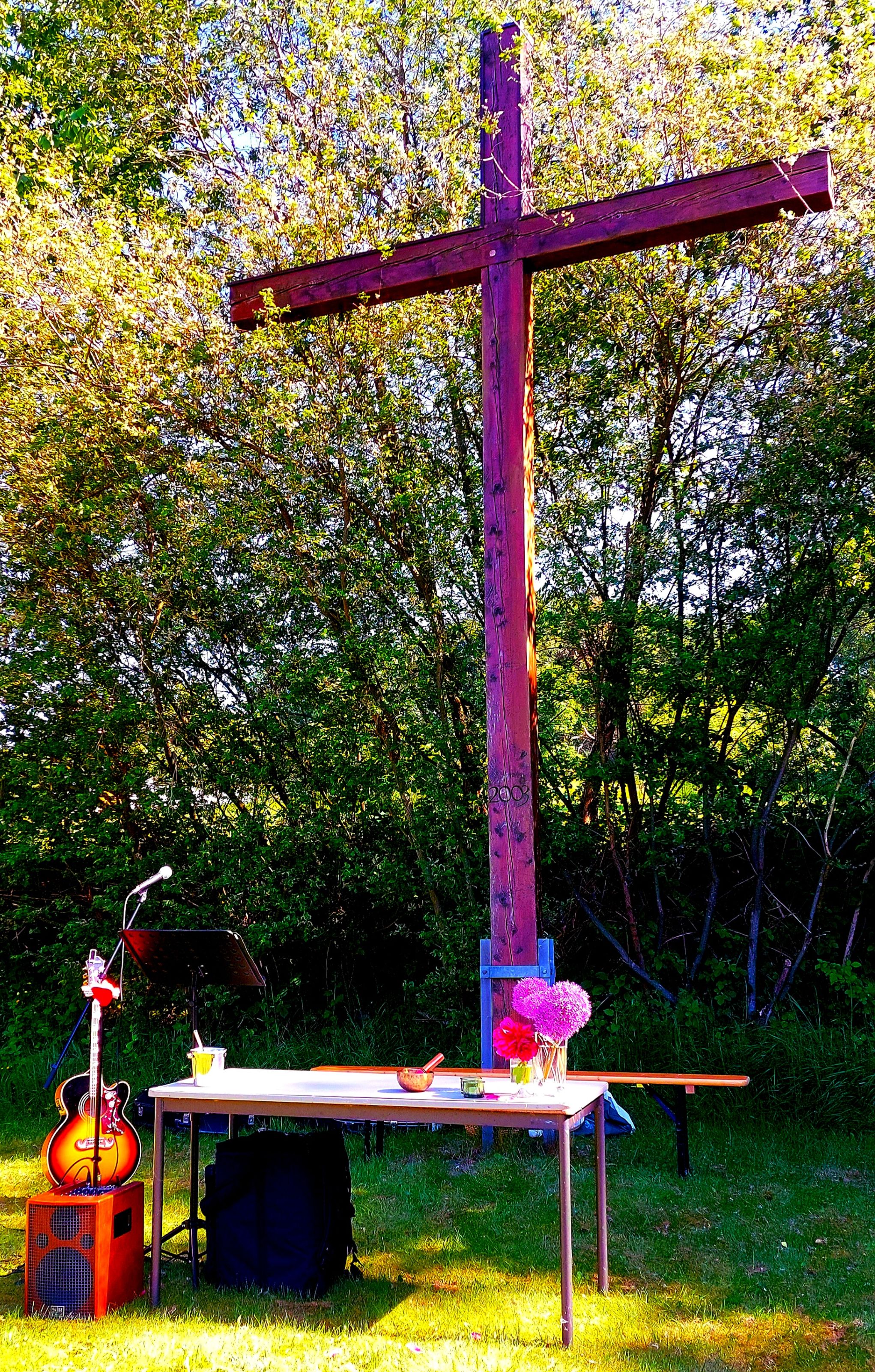 Unter strahlender Sonne und blauem Himmel, auf einer kleinen grünen Wiese im Freien waren die ehemaligen Klassenkameraden und Kameradinnen zusammen gekommen. Singend unter dem Kreuz spielte Diakon Coetsier nach einem eigenen komponierten Stück „Creator“ (Schöpfer) am Anfang das aus dem Gotteslob ausgesuchte „Atme in uns, Heiliger Geist“ (Gl 346) in einer schwungvollen Version und eine rockige Ausführung von „Gottes Wort ist wie Licht in der Nacht“ (GL 450 Kanon), beide wurden mit einem kräftigen Cajón Rhythmus von einem der ehemaligen Schüler untermalt. Ein meditativer Song von Divine Concern „Serene Night“ folgte zur Besinnung nach der Predigt. Zum Schluss spielte der Diakon gemeinsam mit 2 Bläsern (solistisch und klingend in B-Dur) die deutsche Version von „Amazing Grace“ – Ein schöner Tag. Im Chor sind die drei Strophen des deutschen Textes auf dem Liedzettel kräftig mitgesungen worden: