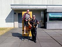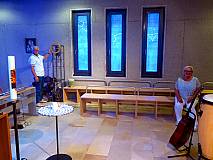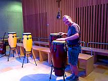 Und so war auch ein Besuch in der Gefängniskirche möglich, wo Gefängnisseelsorger Diakon Dr. Meins Coetsier die Gäste an beiden Tagen – am Sonntag mit Gitarre – zu einem lockeren Kirchenbesuch einlud. Mit dabei waren die Ehrenamtlichen des Gideon-Bundes, Gerhard und Liane Röchow und Peter und Dagmar Hölzer, die Bibeln und Geschenke an die Familien austeilten. Der Ehrenamtliche Musiker Addi Haas spielte am Samstag für die Besucher sowohl auf dem Klavier und dem Akkordeon als auch auf der Orgel und afrikanischen Trommeln. Die Besucher und Besucherinnen freuten sich über die schönen Klänge und Töne der Bongos und Gitarre, die speziell von der Seelsorge zur Verfügung gestellt worden waren. Eine Sonderausgabe einer „Segens-Sterne“-Karte, mit dem Motiv des Sternenhimmels des Andachtsraums, war von den Seelsorgern für den „Tag der offenen Tür“ extra gedruckt worden.