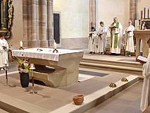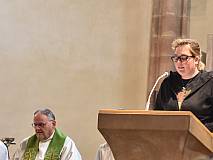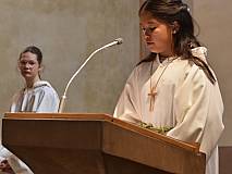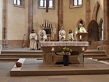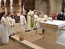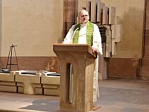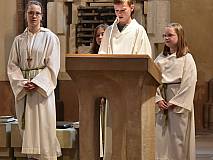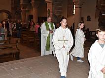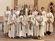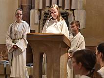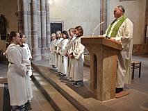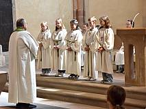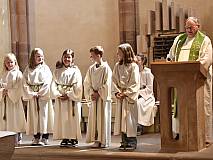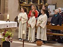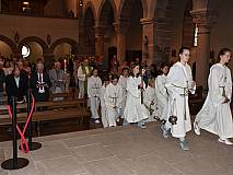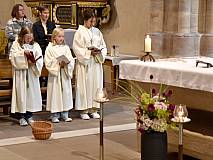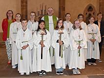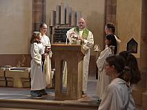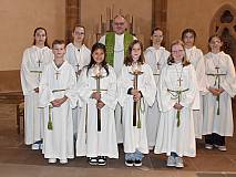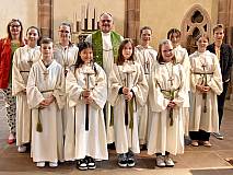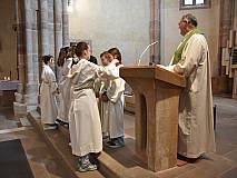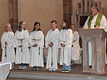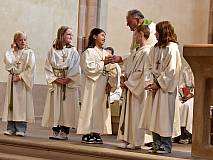 Im Gottesdienst in der Stiftskirche in Rasdorf wurden fünf neue Messdienerinnen und Messdiener eingeführt. Zu Beginn des Gottesdienstes demonstrierte Pfarrer Ulrich Piesche die Leere, wenn keine Messdienerinnen und Messdiener im Gottesdienst anwesend sind. Er betonte, dass diese einen wichtigen liturgischen Dienst tun. Der Gottesdienst sei nur ein Gottesdienst, wenn er die Gemeinschaft fördere. Dazu müssten sich alle einbringen. Messdienerinnen und Messdiener könnten liturgische Elemente wie „Kyrie, Lesung, Fürbitten“ übernehmen und assistierten dem Priester am Altar. Dazu sei es wichtig, den Ablauf der Liturgie nicht nur formal zu kennen, sondern auch deren Inhalt und die damit verbundenen Dienste zu verstehen. Dadurch wären Messdienerinnen und Messdiener in der Lage, in jeder Kirche und bei jedem Pfarrer im Gottesdienst zu assistieren. Pfarrer Ulrich Piesche stellte mit drei Fragen die Bereitschaft zum Dienst fest, die die neuen Messdienerinnen und Messdiener laut mit „Ja“ beantworteten. Anschließend bekamen sie von den schon länger im Dienst stehenden Messdienerinnen unter Beifall der Gemeinde ihr Messdienerkreuz umgehängt und wurden von Pfarrer Ulrich Piesche gesegnet. Das aller Wichtigste sei, die Botschaft von Jesus Christus zu leben und in die Welt hinauszutragen. Die Botschaft der Liebe verhindere, dass die Werte, die für das Zusammenleben wichtig seien, verloren gingen, so Pfarrer Ulrich Piesche in seiner Predigt.