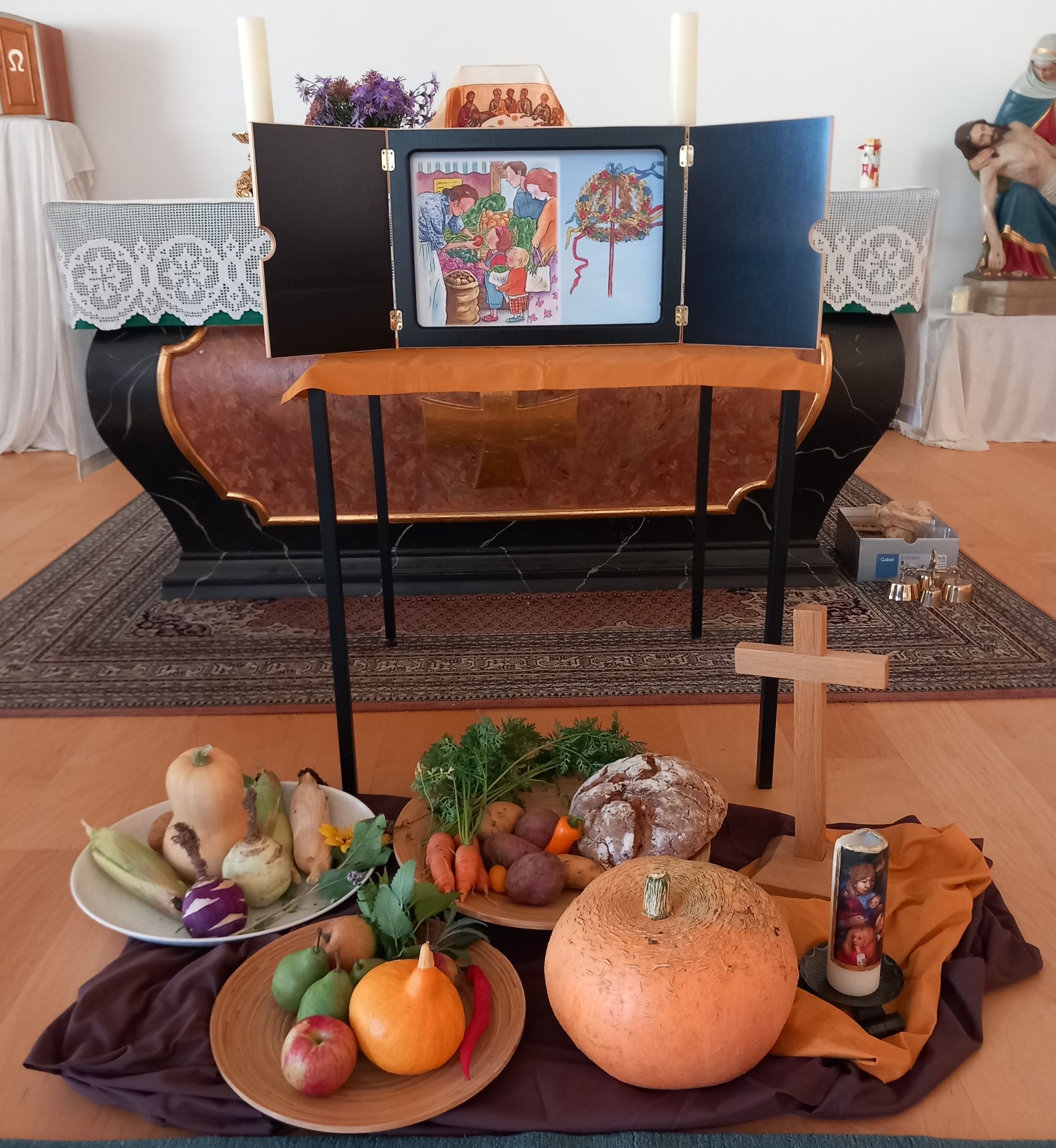 Am Sonntag, den 24.09.2023 trafen sich viele Kinder im Pfarrzentrum in Eiterfeld, um „DANKE“ zu sagen. Viele gute Gaben, die wir gerade ernten dürfen, haben unsere Mitte geschmückt. Kartoffeln, Kürbisse, Äpfel, Birnen, Brot, Möhren, Mais, Paprika, Tomaten und Kohl. Die Kinder durften an den Gaben riechen und sie fühlen.