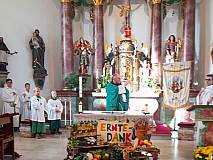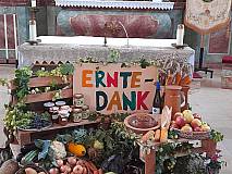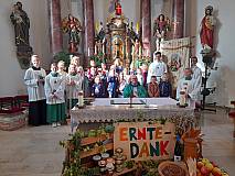 Den feierlichen Gottesdienst zu Erntedank gestalteten traditionell die Landfrauen und die Schola mit. Den Erntealtar hatten die Landfrauen gestaltet und auch für jeden Gottesdienstbesucher kleine Erntesträuße gebunden, den jeder am Schluss überreicht bekam.