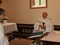 Am Schluss des Gottesdienstes bedankte sich Dechant Blümel beim Domkapitular i.R. und überreichte ihm als Erinnerung bzw. als Stärkung einen hochprozentigen „Rasdorfer“ und die Gehilfersbergkerze.