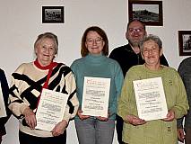 Beim Jahresrückblick ehrte Pfarrer Ulrich Piesche (hinten) (von links nach rechts) Christiane Herber und Gisela Budenz  (beide 60 Jahre), Christina Weller, Marianne Röhr und Siegfried Schilling (alle drei 25 Jahre)