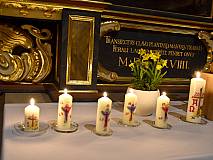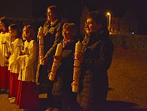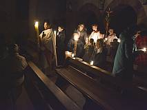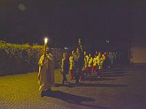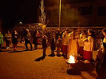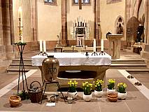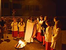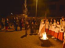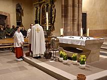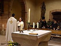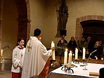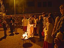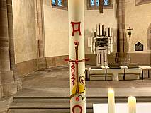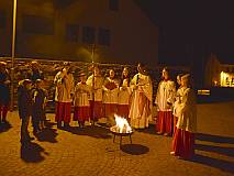 Eine eindrucksvolle Osternachtfeier feierten die Gläubigen in der Stiftskirche in Rasdorf. Zur nächtlichen Zeit um 5.30 Uhr, eigentlich 4.30 Uhr, hätte nicht die Sommerzeit am Ostersonntag begonnen, wurde am Feuer auf dem Kirchplatz mit der Lichtfeier die Osterkerze 2024 entzündet mit den Worten: „Christus ist glorreich auferstanden vom Tod. Sein Licht vertreibe das Dunkel der Herzen.“ Zuvor segnete Pater Binesh Mangalan das Feuer und bezeichnete die Osterkerze mit „Christus gestern und heute, Anfang und Ende, Alpha und Omega, sein ist die Zeit und die Ewigkeit, sein ist die Macht und die Herrlichkeit.“ In die Kreuzbalken und deren Schnittpunkt wurden fünf Weihrauchkörner mit den Worten eingefügt: „Durch deine heiligen Wunden, die leuchten in Herrlichkeit, behüte uns und bewahre uns Christus der Herr, Amen.“ Mit der brennenden Osterkerze zog die Gemeinde durch den Kreuzgang in die Kirche, wo beim „Lumen Christi- Deo gratias“ die Mitfeiernden ihre Kerzen an der Osterkerze entzündeten. Nach den alttestamentlichen Lesungen begannen beim Gloria die Glocken zu läuten und die Orgel wieder zu spielen, die ja seit Gründonnerstag geschwiegen hatten. Ein weiterer Höhepunkt war die Taufwasserweihe. Danach begann die Eucharistiefeier. Pater Binesh erinnerte am Schluss des Gottesdienstes daran, das er im Jahre 2019 zum ersten Mal in der Stiftskirche in Rasdorf die Osternacht gefeiert habe. Diesmal sei es das letzte Mal, da er im November in die Pfarrei Wetter bei Marburg wechselt. Die Osterkerzen für den Gehilfersberg, Grüsselbach, Rasdorf und Setzelbach hatte Christiane Budenz künstlerisch gestaltet. Sie hatte auch gemeinsam mit den Messdienerinnen und Messdienern Osterkerzen gebastelt, die diese nach der Osternachtsfeier mit nachhause nehmen konnten. Dafür ein herzliches Dankeschön.