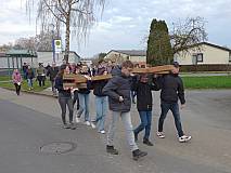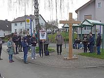 In diesem Jahr führte der Weg mit dem Kreuz von der Kirche Kreuzerhöhung Körnbach nach St. Matthäus Steinbach. Überschieben war er mit „Dein POV“. Was ist ein „POV“? In den sozialen Medien ist es die Abkürzung für Point of View. Mit einem „POV“ zeigt man Dinge aus seiner Sicht oder macht den eigenen Standpunkt klar. In Videospielen wird der Begriff benutzt, um sich mit der Spielfigur zu identifizieren. Mit der Kunstform des Comics bzw. der Graphic Novel und mit Hilfe von Sprechblasen oder geschriebenen Lauten sollen Standpunkte und Sichtweisen gehört und gesehen werde. Der Kreuzweg lud ein, sich mit der Person Jesu zu identifizieren. Die Kirche in Körnbach war gut gefüllt und die Kinder, Jugendlichen und Erwachsenen machten sich mit dem schweren Holzkreuz auf den Weg. Es wurde von mehreren Personen abwechselnd getragen und an den sieben Stationen übernahmen Jugendliche aus den teilnehmenden Gemeinden die Sprecherrollen. Impulsfragen und sich wiederholende Gesangssequenzen, deren Melodie eingespielt wurde, damit die Teilnehmenden mitsingen konnten, waren Bestandteile der einzelnen Stationen. Diese befassten sich mit dem Leidensweg Jesu, der Reaktion der Menschen der damaligen Zeit und stellten im Gebet einen Bezug zu eigenen Lebenswirklichkeit her. Damit animierte der ökumenische Jugendkreuzweg den Blickwinkel Jesu einzunehmen. So korrespondierten Erfahrungen, die Jesus auf seinem Kreuzweg machte, mit eigenen Erfahrungen. In den Gebeten wurde um die Unterstützung gebetet für das Gute einzutreten und die Zukunft durch Glaube, Hoffnung und Liebe zum Osterfest für alle Menschen werden zu lassen. Mit den Fürbitten, dem Vater unser und Segen endete der ökumenische Jugendkreuzweg.