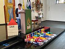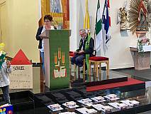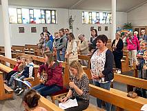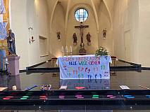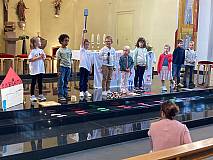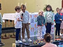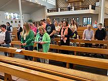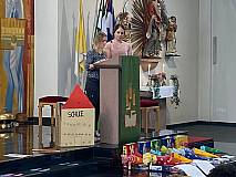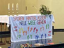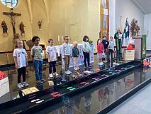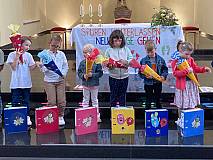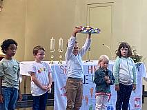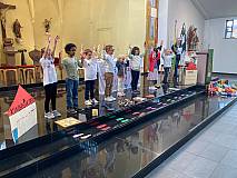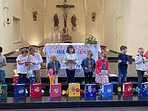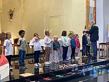 Zum Abschiedsgottesdienst der Schulanfänger der katholischen Kindertagesstätte St. Matthäus, Steinbach (Leiterin Stefanie Liedl) hatten sich die Abgehenden mit ihren Eltern, Geschwistern, Omas und Opas in der gleichnamigen Kirche versammelt. „Spuren hinterlassen-Neue Wege gehen“, mit dem Ende der Kindergartenzeit und dem Schulbeginn nach den Ferien beginne ein neuer Lebensabschnitt, so die zentrale Aussage. Pfarrer Winfried Vogel begrüßte nach dem Lied „Einfach spitze, dass du da bist“ (Gitarre Lisa Zipper) alle ganz herzlich. Man wolle Gott bitten, wenn etwas aufhört und neu anfängt, dass er dabei ist. Mit einem afrikanischen Märchen „Spuren am Weg“, das Katharina Füller und Lisa Wächtersbach vortrugen, sie waren auch für die Organisation des Abschiedsgottesdienstes verantwortlich, zeigten sie, wie man Spuren im Herzen hinterlassen kann. So hätten auch die Erzieherinnen in den Kindern Spuren hinterlassen und umgekehrt diese in den Erzieherinnen. Nach dem Kinder-Mut-mach-Lied erzählten die Kinder, was sie in der Kita Unterschiedliches gelernt hatten, und baten Gott in den Fürbitten um seine weitere Begleitung für sich, die Eltern, Erzieherinnen und die zukünftige Klassengemeinschaft. Nach dem „Vater unser“ gab Pfarrer Winfried Vogel jedem einzelnen Schulanfängerkind den Segen. Zum Abschied bekamen diese ihre Mappen, die sie in der Kindergartenzeit fleißig mit Gemälden, Arbeitsblättern und Fotos gefüllt hatten. Dazu gab es als Überraschung eine kleine „Zuckertüte“. Helen Triesch dankte im Namen der Eltern für die gute und vertrauensvolle Arbeit in der katholischen Kindertagesstätte in Steinbach, die neben der Leitung und dem Vorbereitungsteam noch Roswitha Ritz, Doreen Ruch und Marlena Stelzig leisten. Aus der Hand der Kinder erhielten die Erzieherinnen ebenfalls ein Erinnerungsgeschenk.
