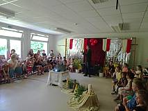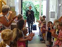 Herr Pfarrer Blümel wurde in der KiTa herzlich empfangen. Mit einem Seifenblasenregen zog er durch die im Spalier stehenden Kinder. Schnell fanden alle in der Turnhalle Platz und los ging es mit der Feierstunde. Die Kinder sangen vertraute Lieder, die auch von den Gästen mitgesungen werden konnten. Die Kinder und Erzieher/innen dankten Herrn Pfarrer Blümel für die schöne Zeit, die sie gemeinsam, bei ganz unterschiedlichen Projekten miteinander erlebt haben. Der Elternbeirat wünschte Herr Pfarrer Blümel alles Gute für den weiteren Weg und so wurde es eine gelungene harmonische und kurzweilige Feier. Besonders bei dem Wissensquiz verstand es Herr Pfarrer Blümel, die Kinder ganz spontan mit einzubeziehen und hatte selbst sehr viel Spaß. Ein sehr emotionaler Beitrag war die Diashow. Es wurde uns bewusst, wie viele gemeinsame Begegnungen, in 18 Jahren, mit Herr Pfarrer Blümel stattgefunden haben.
