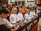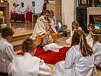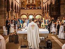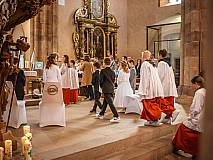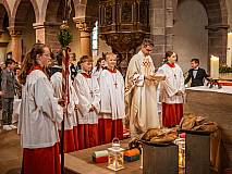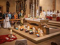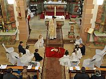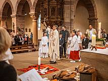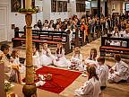 Mit großer Andacht und um den Altar versammelt nahmen die Erstkommunionkinder die Hostie aus der Hand des Pfarrers entgegen. Zum ersten Mal zum "Tisch des Herrn" gingen Lina Beikirch, Sebastian Heimrich, Moritz Noll, Jakob Vogt, Clara Weber, Ernestine Zentgraf (alle Steinbach), Hannes Engel, Bastian Kuschke, Estelle Paul, Lena Volkemer, Matteo Zentgraf (alle Arzell) und Mia Gutmann (Dittlofrod).