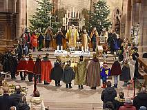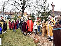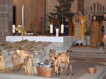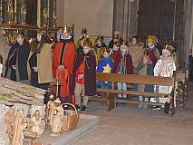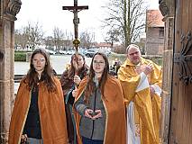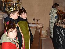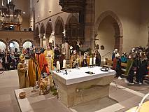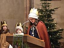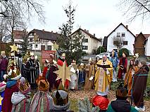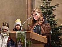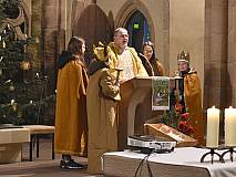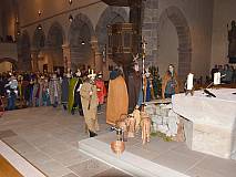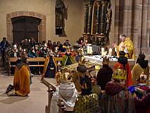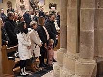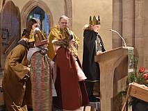 Die vorhergehende Eucharistiefeier stand ganz im Zeichen der Sternsingerinnen und Sternsinger. Diese beteiligten sich beim Kyrie und den Fürbitten und bildeten beim gesungenen „Vater unser“ mit ihren farbenfrohen Gewändern und Kronen einen großen Kreis um den Altar.