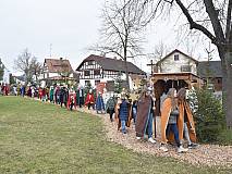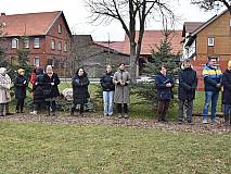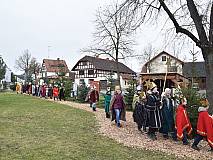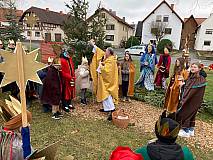 Ausgesandt wurden die Sternsingerinnen und Sternsinger an der Figurengruppe „Heilige Drei Könige“ auf dem Rasdorfer Adventsweg. Es war der letzte Höhepunkt, bevor der Adventsweg in den nächsten Tagen wieder abgebaut wird. Pfarrer Ulrich Piesche segnete die Kreide, die Sternsingerinnen und Sternsinger, sowie alle Anwesenden und sprach ein Segensgebet. Nach einem guten Mittagessen im Konferenzsaal der Point-Alpha-Gemeinde Rasdorf, das das Familiengottesdienst-Team servierte, zogen die einzelnen Gruppen durch die Gemeinde. An die Türen schrieben oder klebten sie einen Aufkleber mit 20*C*M*B*24, Christus Mansionem Benedicat – Christus segne dieses Haus. Man könnte auch sagen Caspar-Melchior-Balthasar und so die Buchstaben mit den Namen der Heiligen Drei Könige, auch die drei Weisen aus dem Morgenland genannt, gleichsetzen. Zumindest wurden in der Vergangenheit die drei Buchstaben so gedeutet. Die Weisen brachten Gold, Weihrauch und Myrrhe, das Wertvollste der damaligen Zeit. Gold steht für Königswürde, Weihrauch für Göttlichkeit und Myrrhe für sein Menschsein, denn im Judentum wurden Verstorbene mit Myrrhe und Aloe gesalbt. Natürlich durfte das traditionelle Lied „Wir kommen daher aus dem Morgenland“ nicht fehlen. Vorbereitet hatten die Sternsinger-Aktion in der Pfarrei Christiane Budenz, die auch für die Messdienerinnen und Messdiener verantwortlich zeichnet und das Familiengottesdienst-Team.