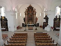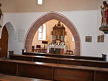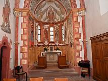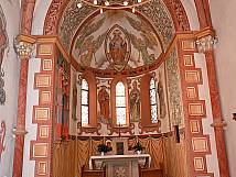 Im Gewölbe der Apsis thront Christus, von Engeln umgeben. Die Chorwand ist mit den Bildern von vier Kirchenlehrern (Stiftungen), mit Rankenwerk und einem Teppichbehang ausgemalt. In der Nordwand ist ein spätgotisches Sakramentenhäuschen (um 1500) eingebaut.