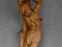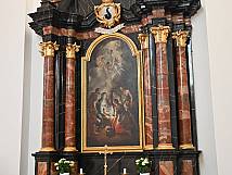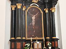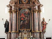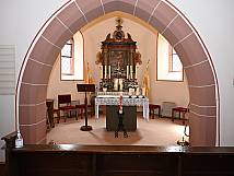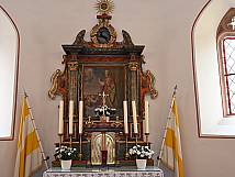 In der Apsis steht ein kleiner spätgotischer Flügelaltar, in seiner Mitte ein bekleideter und gekrönter Christus am Kreuz mit Reliquienöffnung in der Brust. Die beiden Flachreliefs zeigen links das Martyrium des hl. Achatius, rechts das der hl. Ursula.