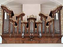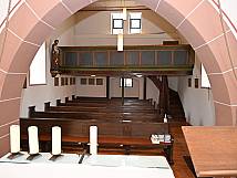 Die Orgelempore an der Westseite ruht auf einem Gewölbe mit drei Korbbögen. Das Schnitzwerk des Orgelprospektes schuf der Lehrer Joh. Anton Schön aus Maberzell. Das Orgelwerk mit seinen 24 Registern stammt von dem Bimbacher Orgelbauer Joh. Markus Oestreich.