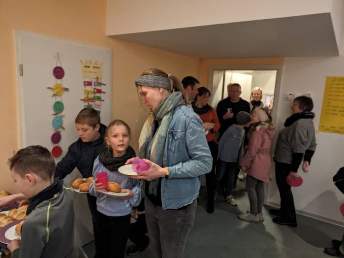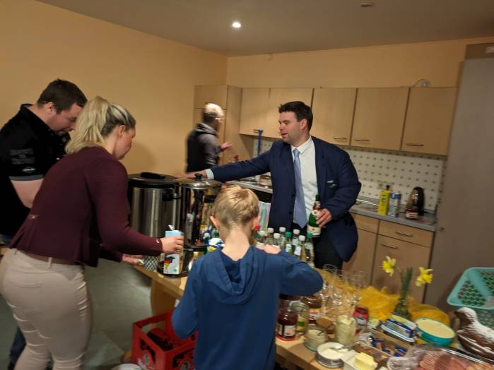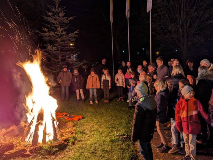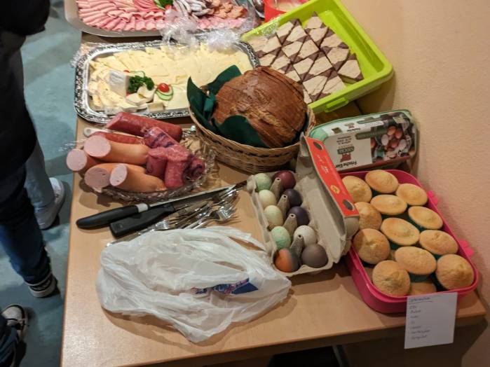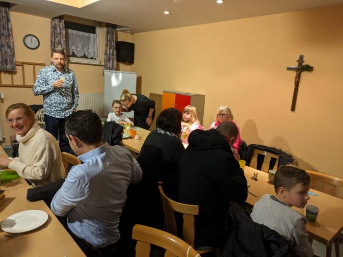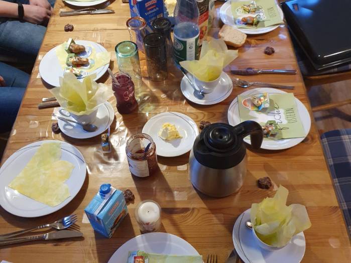 Am Karfreitag kamen alle schließlich in der leergeräumten Kirche von Kleinlüder zusammen, um sich an das Leiden und Sterben Jesu zu erinnern. In aller Frühe, am Ostersonntag, rappelten dann die Wecker in den Häusern der Erstkommunionfamilien. Endlich war es soweit – die OSTERNACHT. Nach einer kurzen Nacht, welche durch die Zeitumstellung noch kürzer war, versammelten sich nach und nach alle Erstkommunionkinder aus Bimbach und Kleinlüder am wärmenden Osterfeuer. Nach der feierlichen Entzündung der Osterkerze feierten alle gemeinsam die Auferstehung Jesu in der Bimbacher Kirche. Nach der Osternacht wartete als Belohnung fürs frühe Aufstehen im Bimbacher Jugend- und Chorraum ein großes Frühstück, bei dem sich Kommunionkinder, Geschwister, Eltern und Messdiener nach der langen Fastenzeit nach Herzenslust stärken konnten.