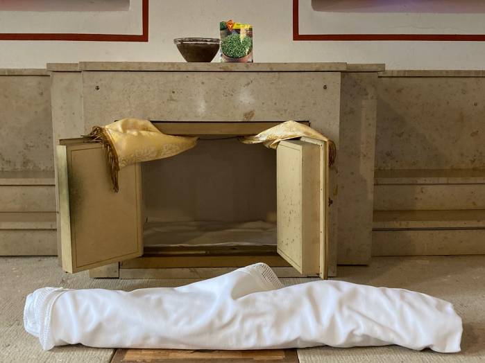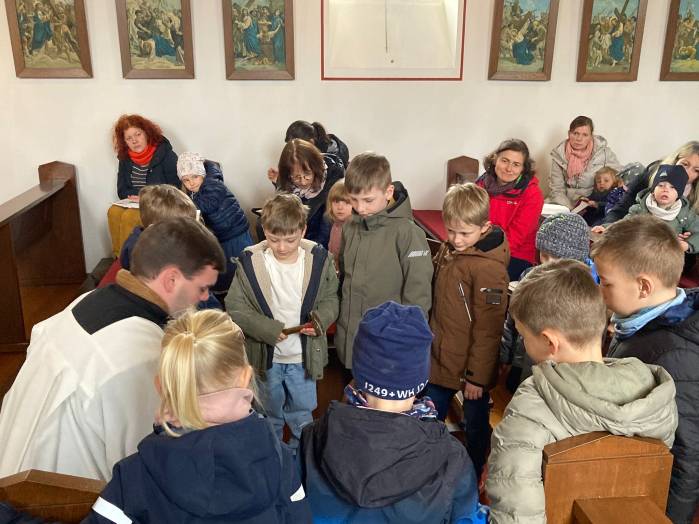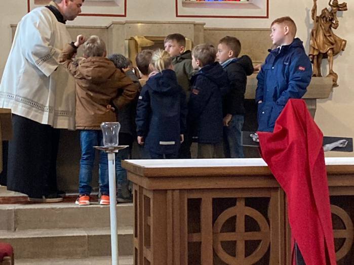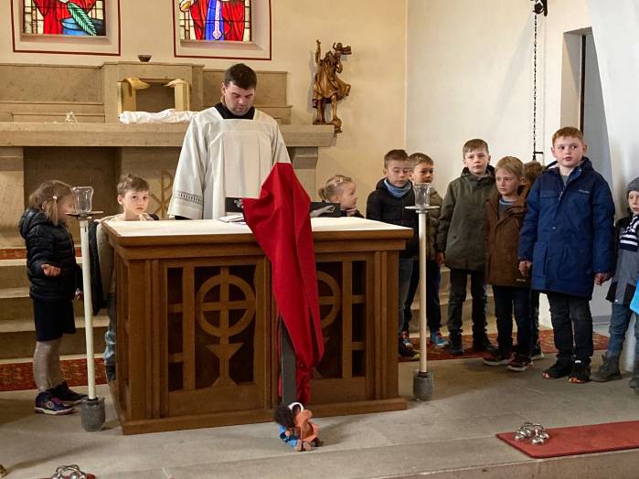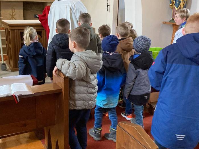 Am Karfreitag gedenkt die Kirche des Leidens und Sterbens Christi. Seit drei Jahren findet anlässlich dieses traurigen Tages in der kleinen Kirche in Lütterz ein Familienkreuzweg statt. Dieser wurde von zahlreichen Kindern aus Lütterz und Bimbach besucht. Während die ernsteren Texte aus dem Gesangbuch die anwesenden Erwachsenen auf das Geschehnis des Karfreitags einstimmen sollten, durften die Kinder im Mittelgang der Kirche den Leidensweg Jesu mit allerlei Materialien und Symbolen erleben. An jeder Station erklärte Gemeindereferent Silbermann, anschaulich was mit Jesus passiert ist. Zu Beginn des Kreuzweges wuschen die teilnehmenden Kinder ihre Hände in Unschuldig und erinnerten sich dabei an Pontius Pilatus und sein feiges Todesurteil. Anschließend trugen die Kinder das Kreuz gemeinsam. Die etwas mutigeren Kinder durften an der zwölften Station 4 Nägel in ein Kreuz hämmern oder an der vierzehnten Station Jesus in ein weißes Tuch einwickeln und auf dem leeren Hochaltar vor dem Tabernakel beerdigen.