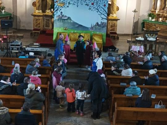 Am letzten Sonntag gab es in Bimbach ein besonderes Angebot für Familien mit Kindern im Kindergarten- und Grundschulalter. Zu Besuch waren die beiden Darsteller und Sänger Gaby und Amadeus Eidner aus Chemnitz. Das Gesangsduo und Ehepaar war bereits im letzten Jahr zu Gast in unserer Pfarrer Heilig Kreuz. In der Kirche von Großenlüder führten sie das Singspiel „Der Franz, der kann´s“ auf. In diesem Jahr besuchten die beiden Sänger und Liedermacher nun Bimbach mit ihrem Stück „Elisabeth, wenn Holzwürmer eine Prinzessin zur Freundin haben.“