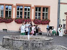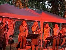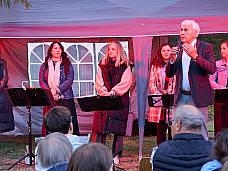 Der Samstagabend stand ganz im Zeichen des Open-Air-Konzerts der Gruppe JoyFul, die ohne Gage auftrat und mit ihrem Repertoir voll den Geschmack und Nerv des Publikums traf. Fünf junge Sängerinnen unter Leitung von Theo Sauer, einem leidenschaftlichen Vollblutmusiker, boten in ihrem fast zweieinhalbstündigen Konzert mit ihrer musikalischen Bandbreite Gänsehaut-Feeling im stimmungsvoll illuminierten Propsteischlosspark. Die Zuhörerinnen und -hörer konnten bei Wein, Snacks und sonstigen Getränken das Konzert mit allen Sinnen genießen. Trotz des kühlen Sommerabends erlebten die Besucherinnen und -besucher einen unvergesslichen Konzertabend. Von daher war wenig überraschend, dass am Ende nicht an Applaus gespart und Zugabe eingefordert wurde.