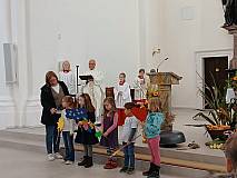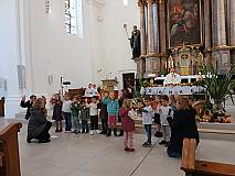 Dankbarkeit im Mittelpunkt. Mit Liedern, Gebeten und kleinen Beiträgen erinnerten sie daran, das auch der Kleinste durch Glaube Großes bewirken kann. Pfarrer Hartl bat zwei Kinder nach vorne zum Erntedankaltar, damit sie