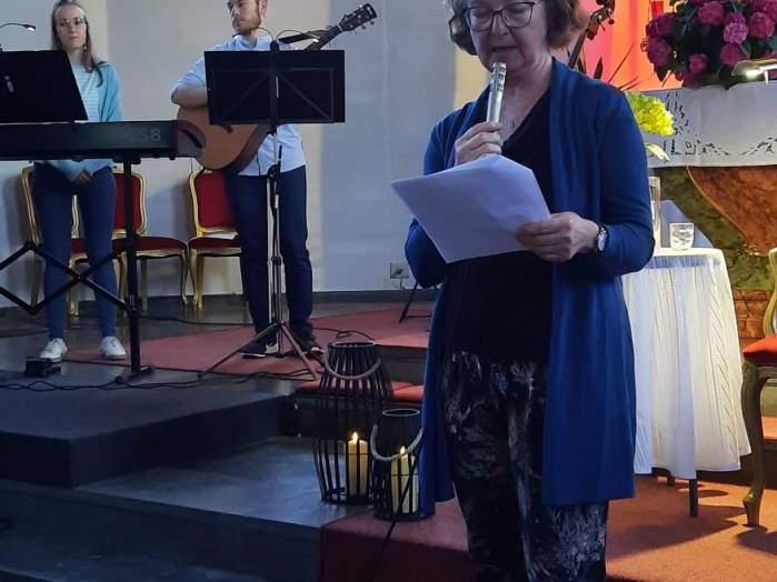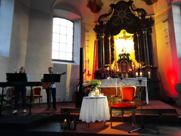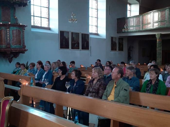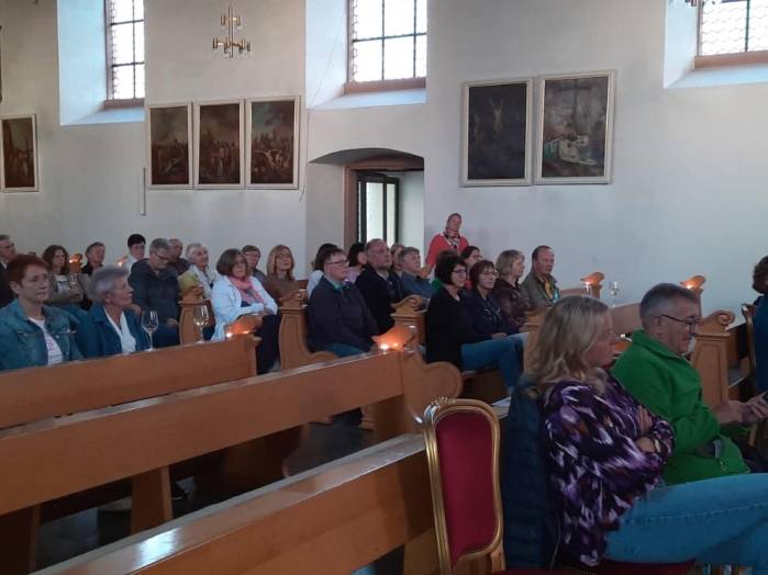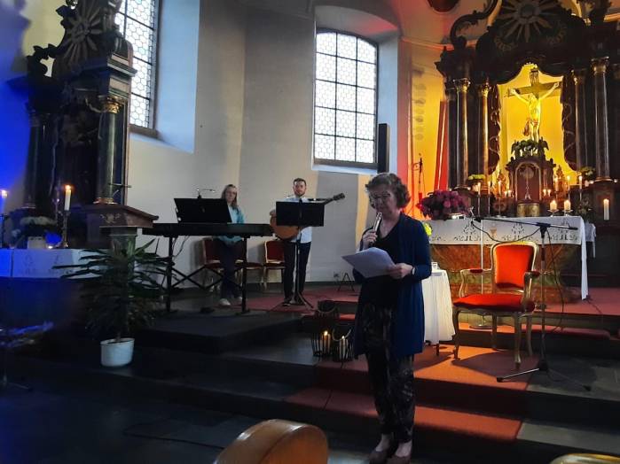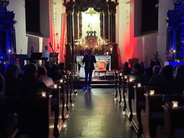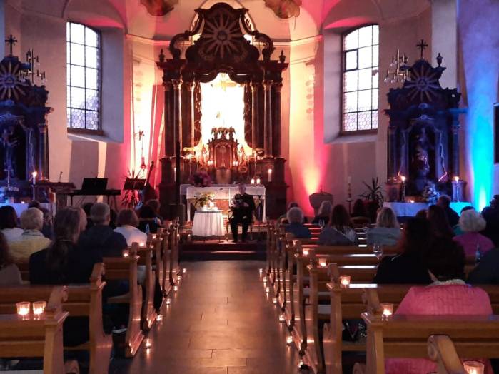 „Spuren der Religion in zeitgenössischer Literatur“ ist das Motto der Reihe „Literatur am Kirchplatz“. Am Freitag, dem 21. Juni kamen etwa 50 Besucher zur Lesung in die Pfarrkirche in Hosenfeld. Wegen des Wetters konnte die Veranstaltung nicht im Freien stattfinden. Mit dem Worship-song „Unter seinem Schirm“ von Samuel Harfst eröffneten Viktoria Blumenthal (Gesang, Klavier) und Lukas Streitenberger (Gesang, Gitarre, Kontrabaß), die den musikalischen Teil übernommen hatten, den Abend. Danach konnte Moderatorin Siegrid Erb den ersten Leser ankündigen. Bürgermeister Peter Malolepszy las aus Ewald Arenz Buch: „Der große Sommer.“ Ihm folgte die Leiterin der Vogelsbergschule Hosenfeld, Karin Meyer-Badenhop mit Passagen aus Raynor Winns Buch „Der Salzpfad.“ Auszüge aus „Das Lichtspiel“ von Daniel Kehlmann brachte Offizial Till Hünermund zu Gehör. Abgeschlossen wurde die Lesung durch die Verwaltungsleiterin im Pastoralverbund Kleinheiligkreuz, Simone Kohlmann, mit einigen Seiten aus dem Werk „Mein Leben mit Martha“ von Martina Bergmann. Musikalisch durften sich die Gäste noch an weitere Songs erfreuen, unter anderem an „When you say nothing at all“ von Roan Keating, „Leichtes Gepäck“ von Silbermond und „Die Reise“
