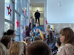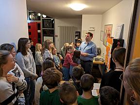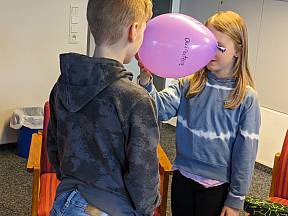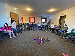 Der erste gemeinsame Morgen begann in der Kapelle mit einem Morgengebet und tollen Gesängen, welche auf der Gitarre durch unsere Gemeindereferentin Kristin Hirsch begleitet wurden. Gut gelaunt ging es schließlich zum Frühstückstisch, um gut gestärkt anschließend in einer Katechese zu erfahren, was in der Beichte alles passiert. In einem kleinen Versuch erfuhren die Kinder, wie sehr Sünden zwischen uns Menschen stehen können und damit Freundschaften und Beziehungen gefährden. Mit dem Tod Jesu am Kreuz, sind uns diese Sünden vergeben, wenn wir sie denn in der Beichte bereuen. Und so durften die Kinder an der Dornenkrone des Gekreuzigten einen Sündenluftballon platzen lassen, als Zeichen der Vergebung von den Sünden und dem nun wieder freien Blick auf meinen Mitmenschen. Nach dieser eindrücklichen Katechese wurden die Anwesenden schließlich durch Besuch aus der Heimat überrascht.