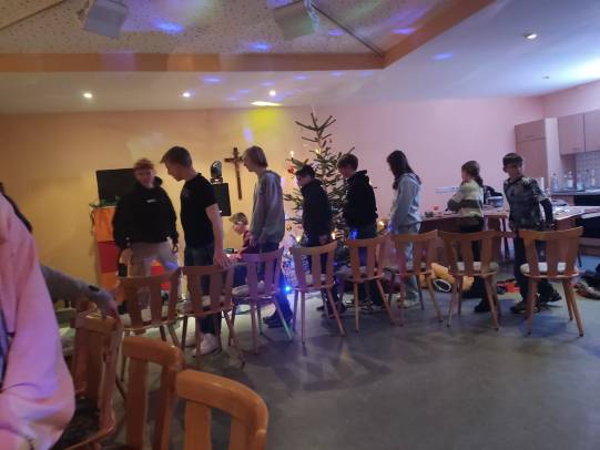 Bei der anschließenden Feier im Jugendraum haben die Gruppenleiter einige Spiele vorbereitet. Hierbei musste ein Messdiener beim Spiel „Kling, Glöckchen, klingelingeling“ herausfinden, welcher Kamerad das Glöckchen heimlich läutete. Bei der Reise nach Bethlehem zeigten unsere Ältesten, dass man auch mit 16 Jahren noch Ehrgeiz beim Erobern eines Stuhls zeigen kann. Außerdem durften alle ihre Teamfähigkeit unter Beweis stellen, in dem alle Messdiener eine lebendige Lichterkette bildeten, welcher allerdings leider verkuddelt war und nur mit gemeinsamem Teamwork wieder auseinanderzubringen war.