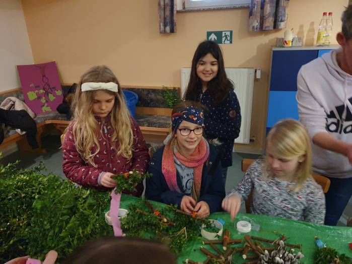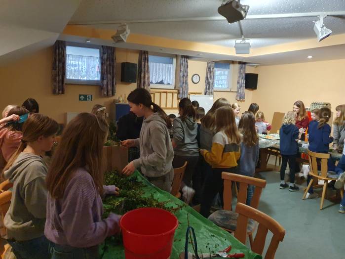 50 Kinder und Jugendliche bereiten die Palmsträußchen für den Palmsonntag vor.