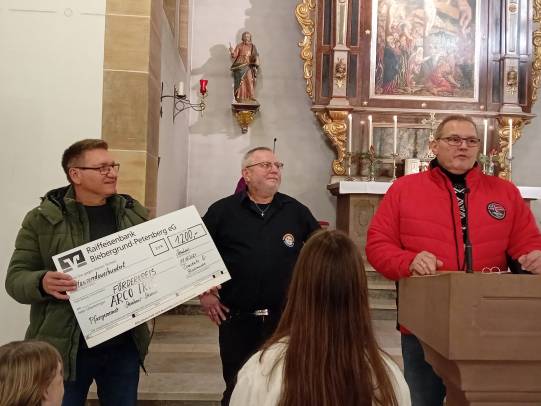 Am Vorabend des zweiten Adventssonntag fand am 7.12.2024 wieder der traditionelle Weihnachtsmarkt des Förderkreis ARCO IRIS statt. Zuvor wurde durch Pfarrer Thomas Witzel in der Steinauer Kirche die Vorabendmesse gehalten, welche von der Band Exhalation musikalisch mitgestaltet wurde. Der in 2002 gegründete Förderkreis ARCO IRIS unterstützt Straßenkinder in Bolivien. Allein in den letzten zwei Jahren konnten ca. 40.000 Euro an Spenden gesammelt und nach La Paz, Bolivien überwiesen werden. Bei einem gemeinsamen Konzert des Chores Concento und der Blechmucke, einer Gruppe des Musikverein Steinau-Steinhaus am 7.11.2024 in der Kirche Steinhaus konnten 1.200,- Euro an Spenden für ARCO IRIS gesammelt werden, dieser Scheck wurde im Rahmen des Gottesdienstes durch Vertreter der beiden Musikgruppen dem Vorsitzenden des Förderkreises, Wolfgang Möller übergeben.
