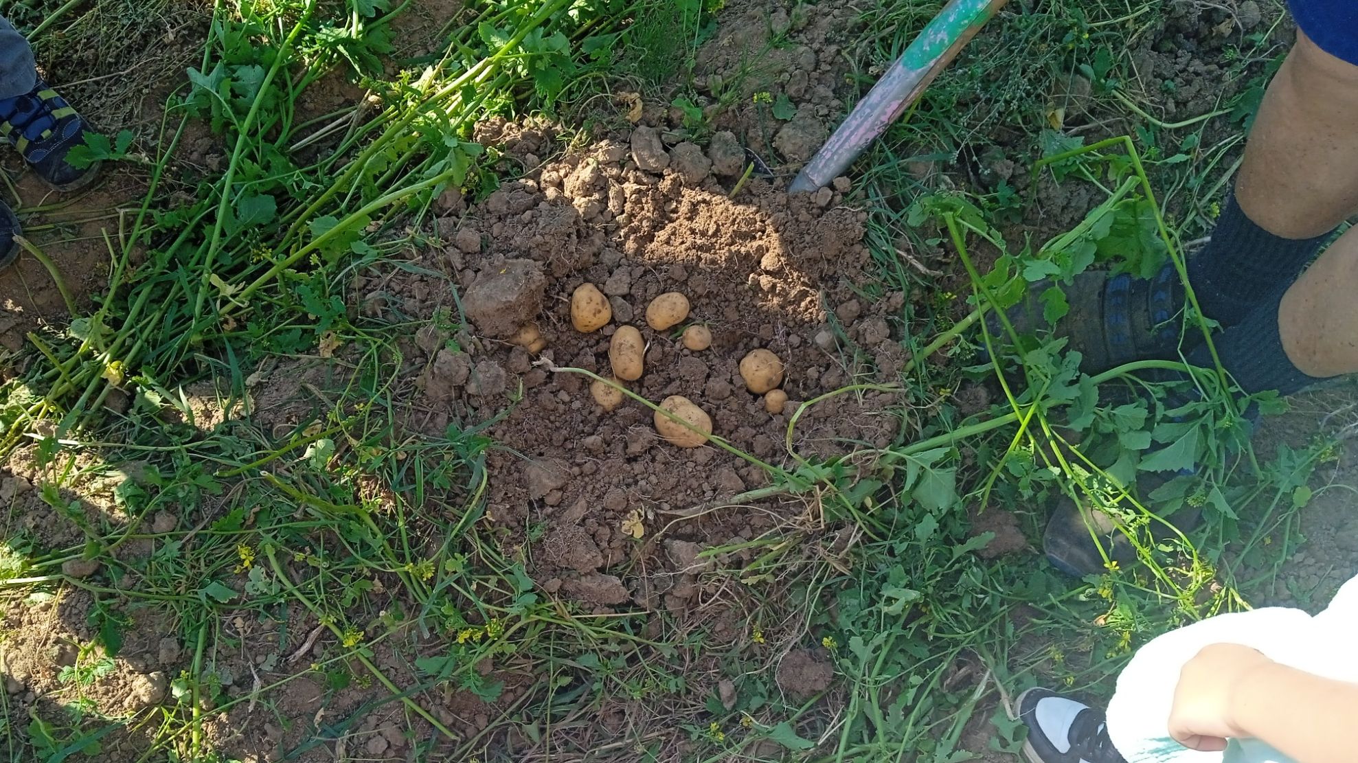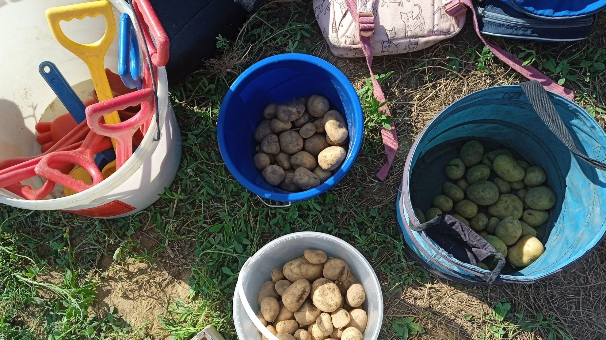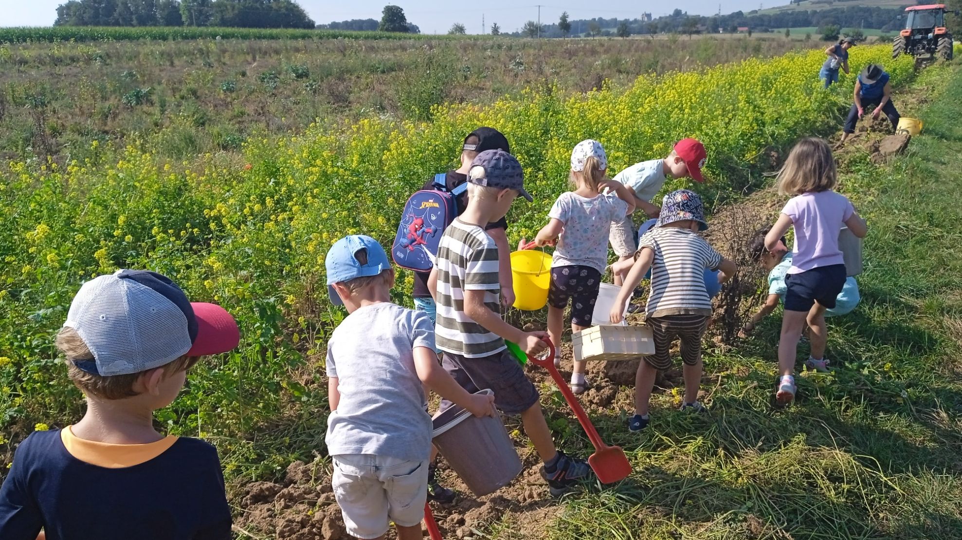 In unserer Kita St. Peter beschäftigt uns gerade das Thema „Kartoffel“. Die Vorschulkinder haben gemeinsam besprochen, wie die Kartoffeln wachsen und was man daraus machen kann. Dann ging es am 02.09.24 gemeinsam auf den Nabu - Kartoffelacker in der Nähe von Almendorf zum Ernten. Frau Hohmann, Herr Bleuel und Herr Rieser erzählten den Kindern viel Wissenswertes rund um die Kartoffel und die Ernte. Wir konnten dem Traktor bei der Arbeit zusehen und beobachten, wie der Kartoffelroder die Kartoffeln aus der Erde gräbt. Alle Kinder waren fleißig beim Einsammeln und die mitgebrachten Eimer schnell gefüllt. Herr Rieser erzählte den Kindern im Anschluss noch einiges über die verschiedenen Tiere, die im oder am Kartoffelacker leben, wie z.B. Kartoffelkäfer, die die Kinder auf die Hand nehmen durften. Auch eine kleine Wühlmaus wurde uns in einem Eimer gezeigt. Es war ein spannendes Erlebnis für die Kinder.