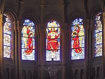 Die Chorraumfenster stellen Christ König und seine Engel dar. Die Rosettenfenster über den beiden Seiteneingängen thematisieren die Krönung und die sieben Freuden Mariens (links) und die sieben Schmerzen Mariens (rechts). Die beiden Fenster über den Seitentüren zeigen (links) die Bekehrung Saulus zu Paulus und (rechts) Jesus und Simon Petrus auf dem See. Alle Fenster wurden in der Farbigkeit nach dem Gesamtkonzept des Architekten Professor Meyer-Speer entworfen. Er wollte den vorderen Raum der Kirche Durch einen farbigen Lichteinfall und gezielt gesetzte Spitzlichter der Ornamente auflockern und farblich beleben.