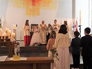 Durch Gebete und Gesänge wirkten sie in dem f estlichen Gottesdienst mit, erneuerten ihr Taufbekenntnis und empfingen zum ersten Mal die Heilige Kommunion – ein zentrales Sakrament der Katholischen Kirche: der Leib Christi in der Gestalt des Brotes (Hostie).