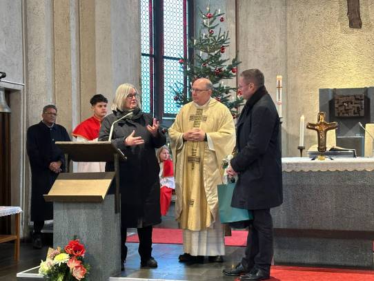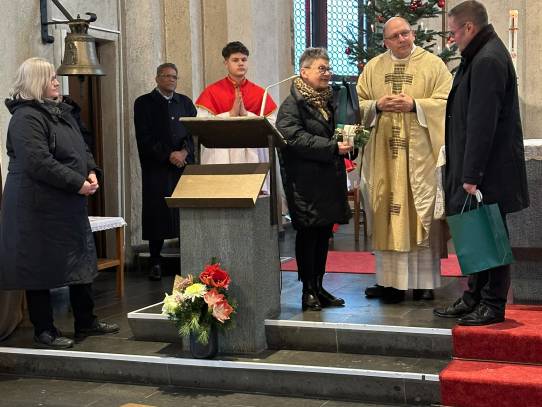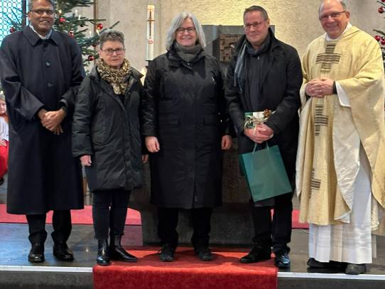Mit einem feierlichen Gottesdienst wurde Regionalkantor Armin Press in der Stadtpfarrkirche Mariae Namen verabschiedet. Vor gut elf Jahren übernahm Armin Press, von Recklinghausen und Münster kommend, die Stelle des Kirchenmusikers in der Pfarrei Mariae Namen und in der Region Hanau. Dechant Andreas Weber dankte ihm für sein Engagement im Dekanat Hanau, insbesondere bei der Ausbildung des kirchenmusikalischen Nachwuchses im Unterricht für die Orgelschüler und Studierenden der Kirchenmusik. „In Erinnerung bleibt die Einführung der Lieder im damals neuen Gesangbuch „Gotteslob“. Bei der Neugründung der Pfarrei St. Klara und Franziskus und der Vorbereitung auf das Zusammenwachsen mit weiteren Pfarreien der Region haben Sie Ihre Erfahrungen aus früheren Dienstorten in der Pastoralen Dienstgemeinschaft eingebracht.“, so Dechant Weber. Er dankte Press für die Errichtung eines regelmäßigen „Kirchenmusik-Stammtisches“ für die nebenberuflichen Organisten und Chorleiter der Region und erinnerte an die Begleitung von Orgelbauprojekten, wie den Bau der neuen Weimbs-Orgel in der Kirche Heilig Geist in Hanau-Lamboy und die Organisation von regelmäßigen Orgelfeierstunden mit regionalen Organisten. Frau Ricarda Sommer-Charrier vom Verwaltungsrat, Pfarrer James und Pfarrer Manuel Stickel hoben sein Engagement für den Kirchenchor, die Frauenschola und den Kinderchor sowie die Gestaltung der monatlichen Fatima-Messe am Kirchort Mariae Namen hervor.